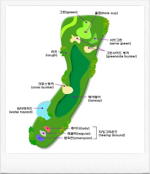 - 블루 : 챔피언 티로 사용될 때는 프로골퍼나 골프 대회 시 이용하며 아마추어 중/장타자 이용