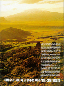 “표고 5,165m의 아라랏산은 구약성서 창세기에 기록된 그 유명한 노아의 방주가 멎었던 산. 이곳을 지나간 고금의 모든 여행가들은 이 노아의 방주의 산에 대해 언급해 놓고 있으며, 이를 확인하기 위한 탐험대가 1829년에서 1955년에 이르기까지 수십 차례 파견돼 오기도 했었다. 1883년 터키 군부에서 파견된 탐험대가 정상 부근의 빙하에서 거대한 골조의 목조물을 발견하였고, 1916년에는 러시아 군부에서 150명에 이르는 대탐험대를 파견 거대한 배의 유해를 발견했었다. 프랑스의 탐험가 페르난드 나바라는 18년 동안 노아의 홍수와 방주에 관한 면밀한 문헌 조사 끝에 그 진실성을 인정하고 1952년부터 3년간에 걸쳐 현지 탐사를 감행했다. 그는 4,100m 지점에서 거대한 배의 현(舷) 부분을 발굴, 1m 50㎝로 잘라서 짊어지고 돌아왔다. 전문가에 감정시켜 보았더니 구약성서시대의 목재임이 틀림 없다는 고증을 얻은 것이었다.”
