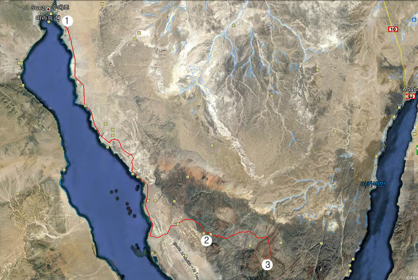 1.마라의 샘 2.르피딤(오아시스 훼이란) 3.시나이 산. 마라의 샘에서 시나이 산까지는 대략 276km.