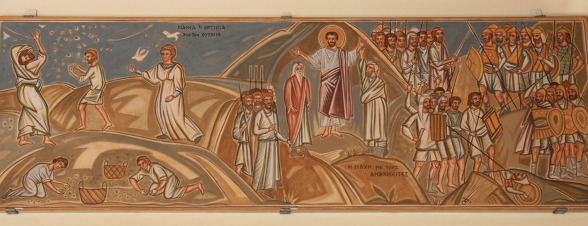 성 카타리나 수도원 모세의 우물 옆에 있는 프레스코화. 왼쪽은 만나와 메추라기, 오른쪽은 아말렉을 무찌르는