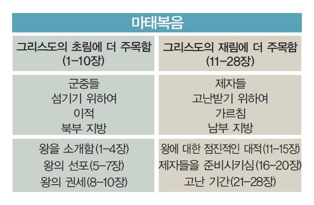 유대인 지도자들이 예수님을 왕으로 모시기를 반대한 뒤(11-15장), 예수께서는 자신의 임박한 죽음과 부활(21-28장)을 위해 제자들을 준비시키셨다(16-20장). 메시아께서는 ‘유대인의 왕’이라는 패가 달린 십자가에 못 박혀 죽으셨다.