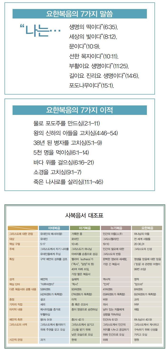 요한복음은 하나님의 아들로서 예수님의 역할을 강조한다. 이 책의 내용 가운데 오직8퍼센트만이 다른 복음서의 내용과 중첩되고, 나머지 92퍼센트는 독특한 내용으로 되어 있다. 요한복음은 그리스도가 다른 인간들과는 전혀 다른 절대적으로 유일무이한 분임을 강조한다. 그분은 다름 아닌 육체를 입고 세상에 오신 하나님이시기 때문이다!