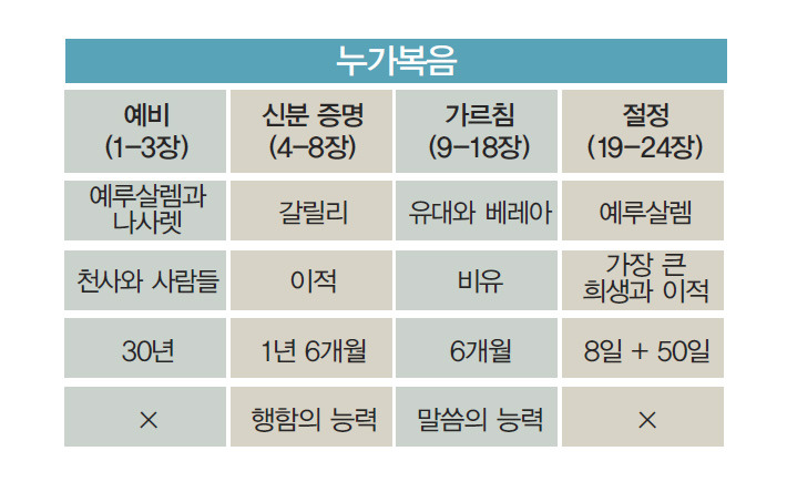 누가는 예수님의 혈통에 대해 가장 길게 설명함으로써 예수님이 보통 사람은 아니라는 점을 명확히 밝히고 있다. 예수님은 완벽한 인간이요, 동정녀에게서 나신 분으로,인간성을 입으신 유일무이한 신인(神人, God-Man)이다. 그분의 육신의 어머니는 마리아이지만, 그분의 아버지는 바로 하나님이시다. 예수께서는 ‘죽기 위해’(하나님께는 죽음이 없으므로) 인간이 되셔야 했지만, 동시에 그 죽음이 세상의 모든 죄를 속(贖)하기 위한 유효한 죄 값이 되려면 하나님이셔야 했다.
