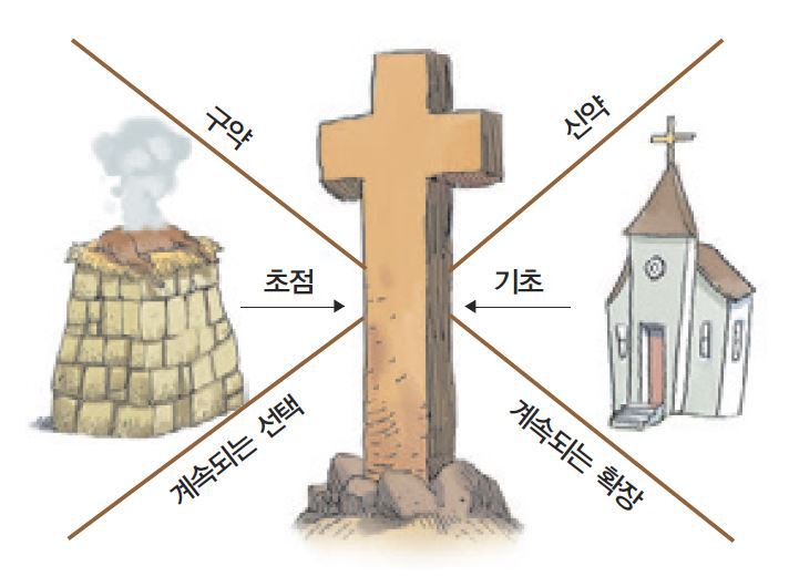 구약은 십자가를 향해 점점 좁아지는 ‘>’자 모양의 쐐기와 같고, 신약은 십자가로부터 세상을 향해 점점 확대되는 ‘<’자 모양의 쐐기와 같다. 성경은 처음 시작할 때와 마찬가지로, 하나님께서 어떠한 방해도 받지 않으시고 우주 만물을 완벽하게 통치하시는 것으로 끝난다.