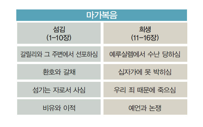 마가복음의 3/8(총 16장 가운데 6장)이 십자가 사건 이전의 마지막 주간을 다루고 있다. 종의 가장 큰 일이 바로 대속(代贖)의 죽음이기 때문이다. 그리스도께서는 으뜸이 되기 위한 합당한 길이 섬김이라는 것(막 10:44)을 본으로 보여주셨다.