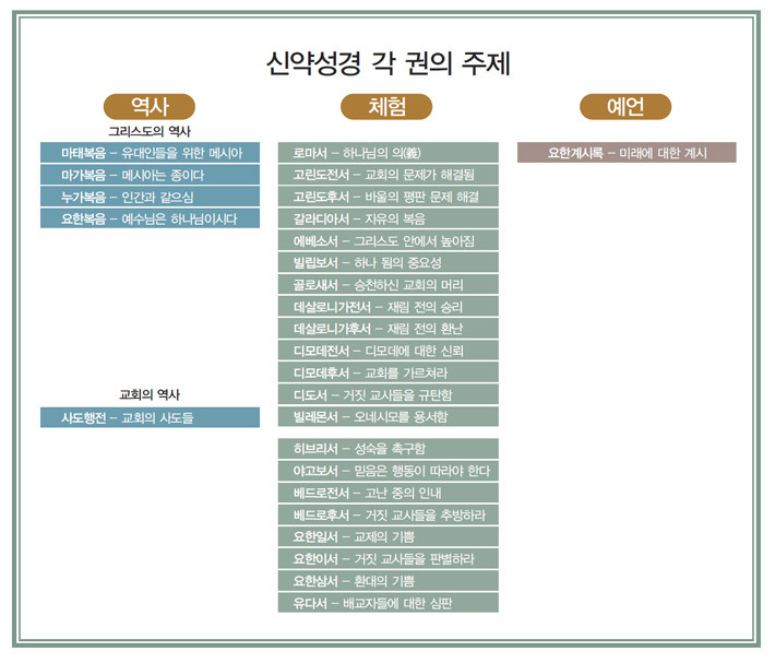 이번 장에서는 이 책 5장에서 했던 것처럼, 망원렌즈로 파노라마를 보듯이 신약성경을 촬영하면서 27권 각각의 책에 제목을 붙여보겠다. 이 책 5장에서처럼 책 이름의 첫 자와 제목의 첫 자가 일치하는 것(영문의 경우이지만 한국어판 독자들을 위해 영문도 함께 표기했음 – 역자 주)은 우연의 일치가 아니다. 두운법을 도입해 좀 더 쉽게 외울 수 있도록 했다.