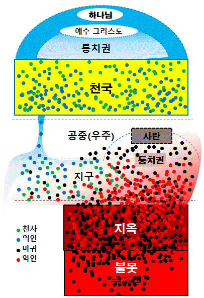| 지구 | 의인들(예수 그리스도를 신실하게 믿는 성도들)교회/수호천사들 | 악인들(예수 그리스도를 거부하는 자들)마귀/귀신(사람들을 미혹/참소)거짓종교/진화론/무신론/공산당뉴에이지/New World Order/바벨론 |