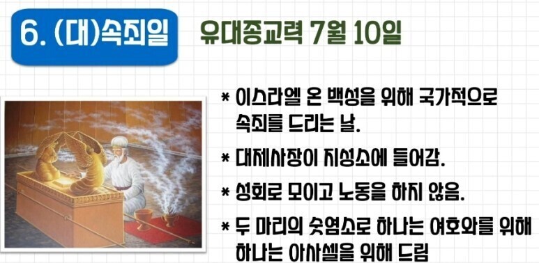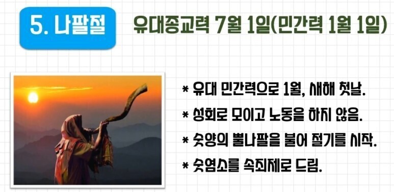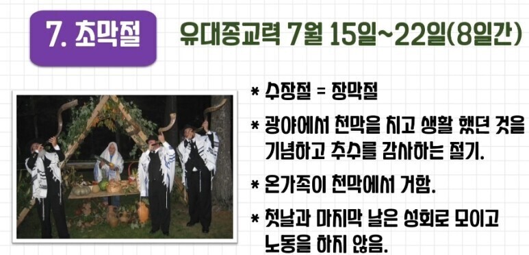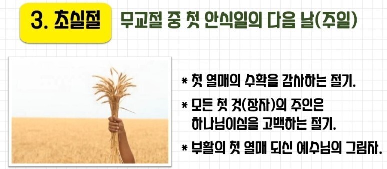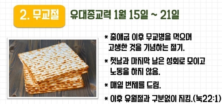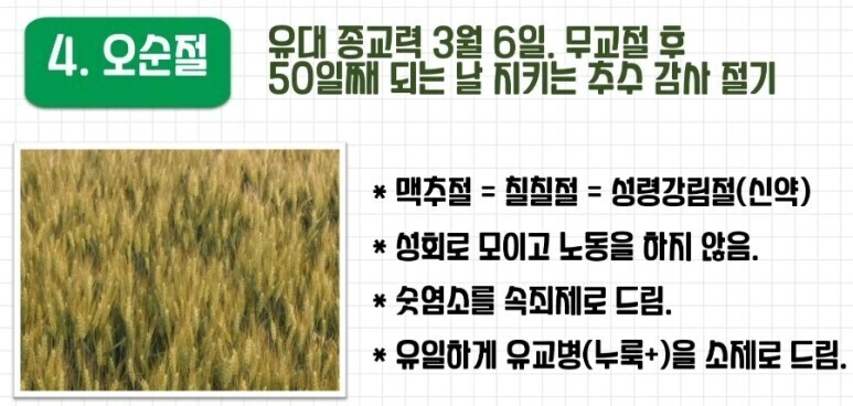 구약의 7대절기(유월절,무교절,초실절,오순절,나팔절,속죄일,초막절) 작성자야베스|작성시간23.10.16|조회수670 목록 댓글 0 글자크기 작게가 글자크기 크게가 구약의 7대절기(유월절,무교절,초실절,오순절,나팔절,속죄일,초막절) 유대종교력은 출애굽한 달을 1월로 계산하는 달력임. 다음검색 현재 게시글 추가 기능 열기 북마크 공유하기 신고 센터로 신고 댓글 댓글 0 댓글쓰기 답글쓰기 댓글 리스트