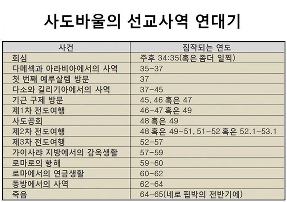 먼저 바울의 생애에 있어서 중요한 사건의 연대를 정해 둘 필요가 있다. 그러나 바울서신에도, 사도행전에도 아무런 명확한 연대가 기록되어 있지 않기에 예수 그리스도 승천 후 5년 AD35년경에 회심을 한 것으로 알려져 있다.