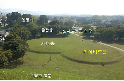 이 표주박형태 고분의 뒷쪽(북쪽)분이 봉황 앉은 금관이 출토된 서봉총이고 같이 붙은 분(墳)의 남쪽분이 '데이비트총'이다.