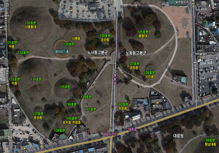 가운데 봉황로를 기준으로 왼쪽이 노서동고분군이며 오른쪽이 노동동고분군이다