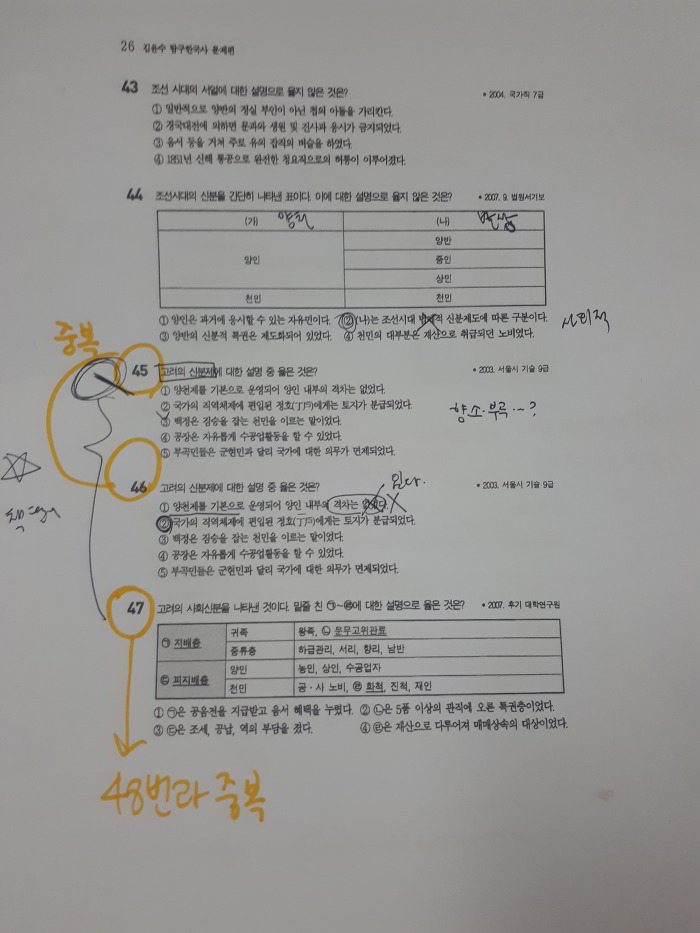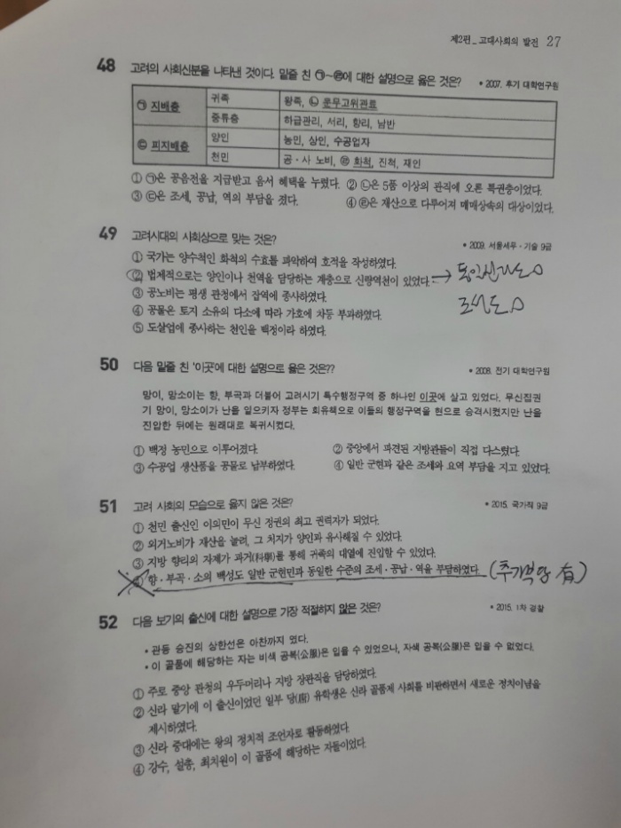 2편 고대사회의 발전 26쪽에 "45번 문제"와 "46번 문제"가 2003 서울시 기술 9급으로 같은 문제이고,