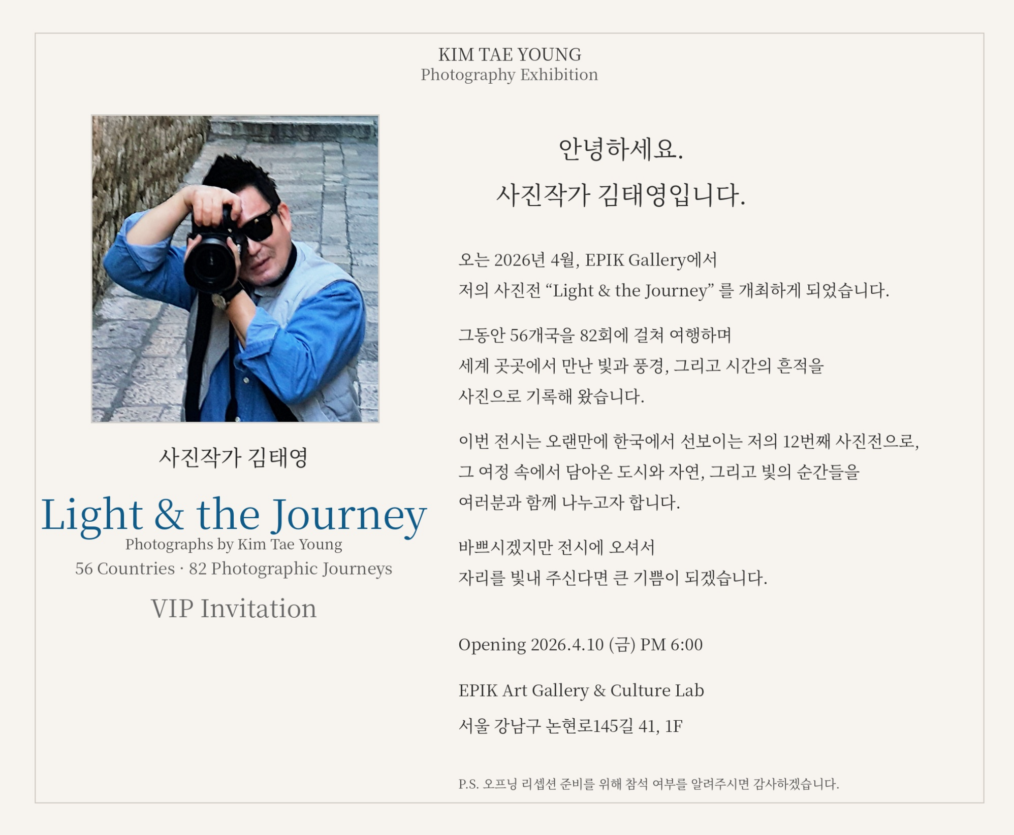 세계 56개국 82회 해외 출사를 통해 빛이 만들어내는 순간의 조형성과 감정의 잔상을 꾸준히 탐구해왔습니다.