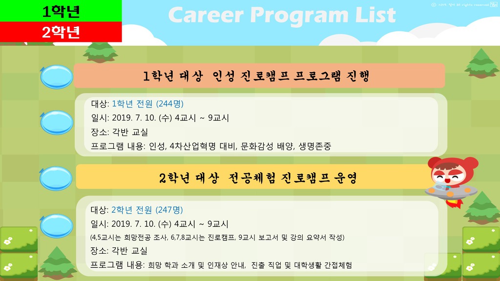 2019년 7월 10일 : 1·2학년 대상 진로 프로그램 안내 작성자기획홍보부장|작성시간19.07.10|조회수121 목록 댓글 0 글자크기 작게가 글자크기 크게가 다음검색 현재 게시글 추가 기능 열기 북마크 공유하기 신고 센터로 신고 댓글 댓글 0 댓글쓰기 답글쓰기 댓글 리스트