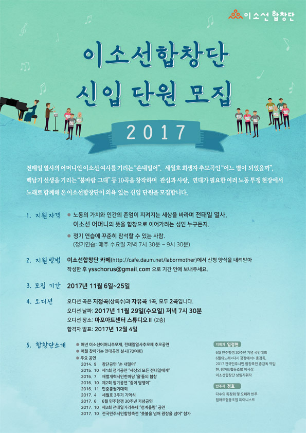 - 오디션 곡 :지정곡(상록수: 첨부된 악보를 보고 연습하세요)과 자유곡 1곡, 모두 2곡입니다.