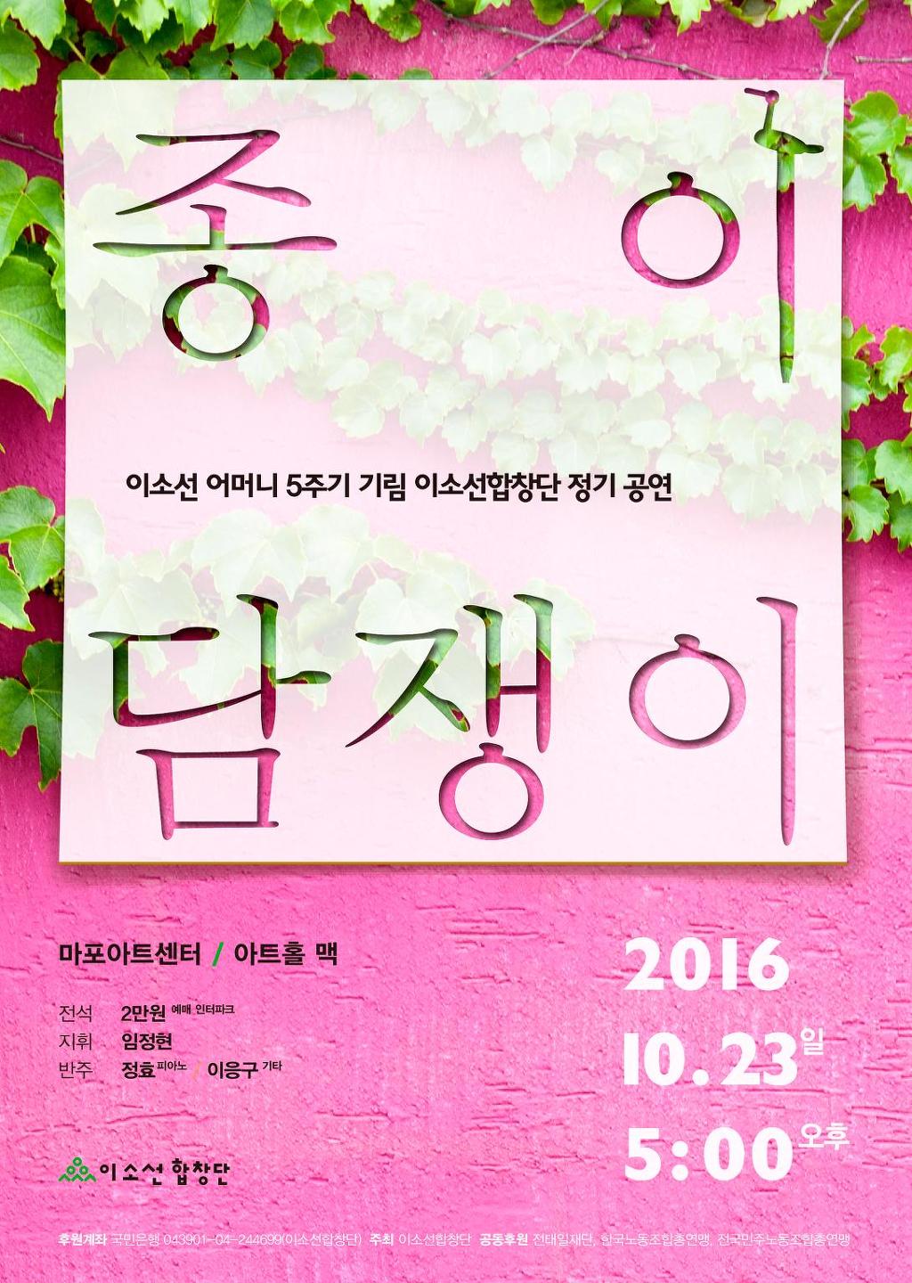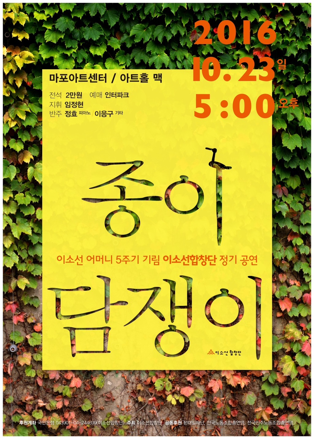 종이담쟁이 포스터 ( 이소선어머니 5주기 기림 이소선합창단 정기공연) 작성자이영희|작성시간16.09.19|조회수195 목록 댓글 0 글자크기 작게가 글자크기 크게가 web용 입니다~ 다음검색 현재 게시글 추가 기능 열기 북마크 공유하기 신고 센터로 신고 댓글 댓글 0 댓글쓰기 답글쓰기 댓글 리스트