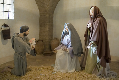 중간쯤에는 프란치스코 성인이 성 가정을 방문하여 아기 예수님을 경배하는 실물크기인 구유가 나온다.