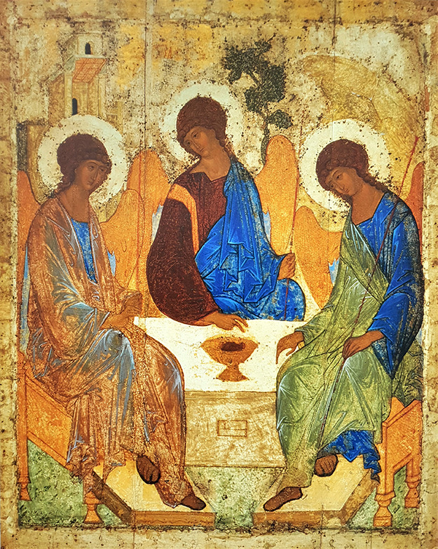 여러 이콘 중에서 가장 돋보이는 작품은 안드레이 루블료프(Andrei Rublev, 1360~1430년경) 수도자가 그린 ‘구약성경의 삼위일체’(1411년경, 112x141cm)다. 비슷한 형상을 한 성부와 성자와 성령 하느님께서 식탁 주변에 앉아 고요한 가운데 사랑과 친교를 나누는 모습이다. 삼위이신 하느님께서 하나를 이루는 모습이 참으로 아름다우면서 거룩하게 표현됐다. 식탁 앞의 빈 공간은 이 성화를 보는 사람들을 위해 미리 마련해 둔 자리처럼 보인다.