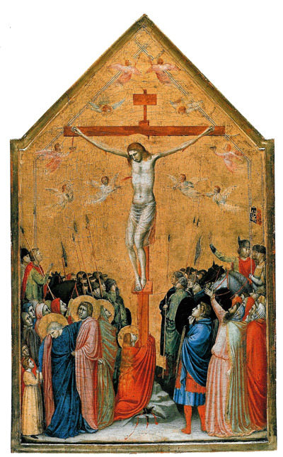 예수님의 두 발은 못 하나로 모아서 쳤다. 십자가 발치에 막달레나가 매달렸다. 성모 마리아가 쓰러지면서 요한의 부축을 받는 것은 14세기 이후의 미술 전통이다. 이 그림에서 볼 수 있는 것처럼 이탈리아 화가들은 가시나무 왕관을 그리는 일이 드물었다.
