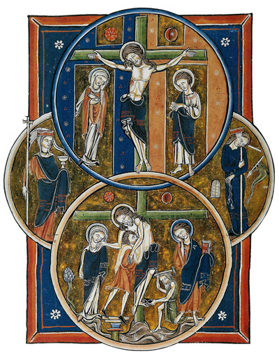 그림1은 카스틸리아의 블랑카 기도서에서 그리스도의 수난 이야기를 다룬 장면을 보여준다. 고딕 전성기에 탄생한 작품답게 그림 구성이 꼭 중세 고딕 성당의 색유리창과 닮았다. 그림 안에 모두 네 개의 원이 서로 겹쳐 있는데, 각각의 내용에 따라 위계가 정해졌다. 맨 위쪽 둥근 그림은 십자가에 달리신 예수님과 그 아래를 지키는 마리아와 요한을 그렸다. 십자가 어깨 위로 해와 달이 붙었다. 원래 「유다인의 왕 나자렛 예수」라고 쓴 명판도 붙어 있어야 하는데, 웬일인지 보이지 않는다. 요한 복음서에는 빌라도가 직접 써서 십자가 위에 붙였다고 하니, 빌라도의 필력을 확인할 수 있는 좋은 기회였는데 아쉽다. 가시나무로 엮은 왕관도, 발받침대도 빼놓고 안 그렸다.