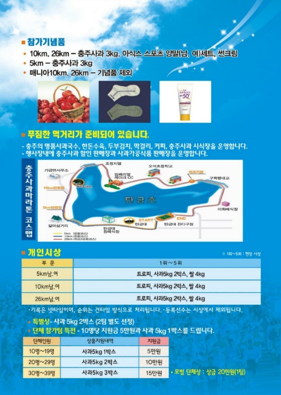 - 10Km, 26Km : 충주사과 3Kg, 아식스 스포츠 양말(남,여) 세트, 썬크림