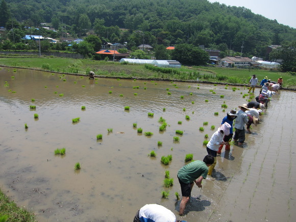경기도 군포에 소재한 귀농운동본부의 실습 논. 여기만 총 600평이다. 이 정도만 해도 까마득하지 않은가? 사람들이 주르륵 늘어서서 그렇게 보이지, 기계로 하면 금방이다.