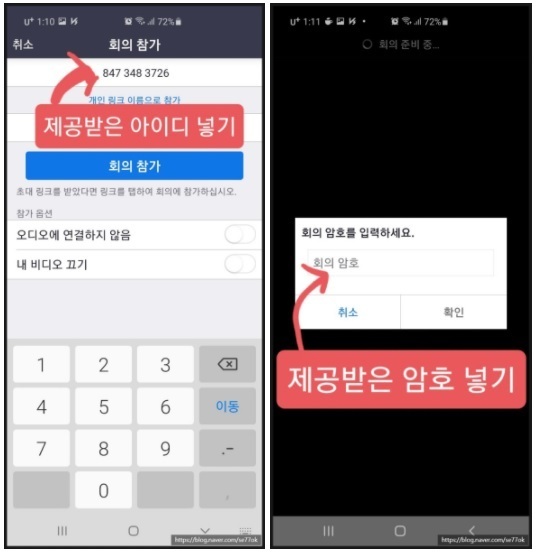 (2)회의 ID와 비밀번호를 입력하여 줌 열기