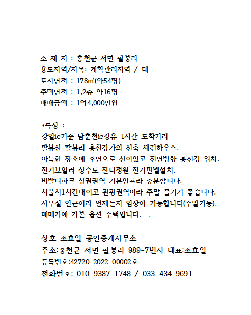 홍천군 대명비발디파크인근 홍천강가 신축 옵션포함 세컨하우스 1억4천만원 작성자조효일공인중개사|작성시간25.12.10|조회수12 목록 댓글 0 글자크기 작게가 글자크기 크게가 다음검색 현재 게시글 추가 기능 열기 북마크 공유하기 신고 센터로 신고 댓글 댓글 0 댓글쓰기 답글쓰기 댓글 리스트