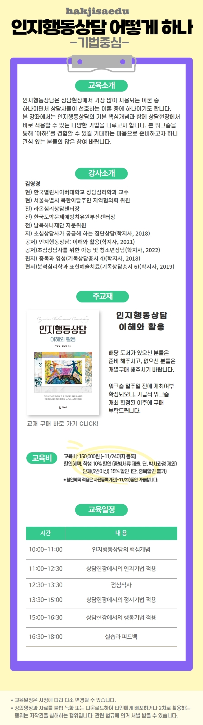 학지사에서 주관하는 "인지행동상담 어떻게 하나?(기법중심)" 특강이 24년도에도 진행하게 되었습니다.