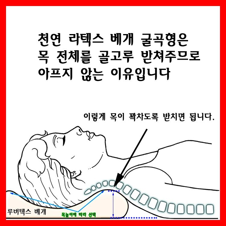 천연라텍스 베개는 천연고무 원액을 부드럽게 발포시킨 것이라 부드럽지만, 짱짱하게 떠받쳐주므로 편안하게 주무실 수 있는 베개인데, 워낙 편안하다는 소문이 돌자 짧은 시간에 시골의 어르신들도 다 알다시피 한 제품이라 지금은 현명하고 재치 있는 사람들이라면 거의 다 사용할 정도며, 목이 아프니까, 천연라텍스 베개 중에 굴곡형 종류를 사서 바짝 끌어당겨 베시면 편안하게 주무실 수 있습니다.