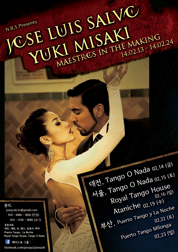 완성된 거장들, 화려한 챔피언의 모습들도 좋지만 부에노스아이레스 현지에서는 지금도 만들어지고 있는 수많은 젊은 마에스트로들, 젊은 챔피언들이 있습니다. 거리와 밀롱가를 채우는 젊은 마에스트로들 중 가장 완성도있는 춤을 보여주는 호세 루이스와 유키 두 사람은 대전, 서울, 부산을 거치며 2014년 2월 13일부터 24일까지 공연과 워크숍, 개인레슨 등을 통해 한국의 땅게로스들에게 다가가겠습니다.