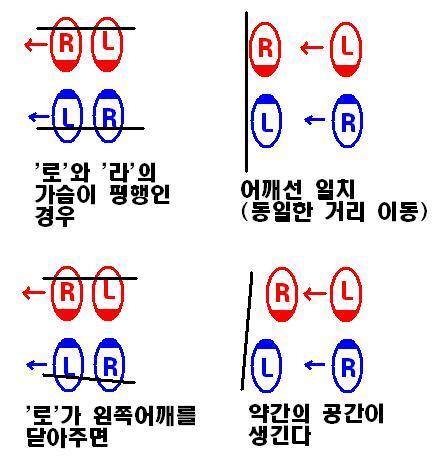 ; 유튜브나 여러 동영상을 보면 4차선으로 나가도 (우리가 연습한 것과는 달리) 상체가 거의 돌아가지 않는 것을 볼 수 있습니다. 초급에게는 약간 어려운 이야기 일 수 있는데, 그것은 이런 리드가 눈에 보이지 않는 근육차원의 힘(에너지)전달으로 이루어지기 때문입니다. 힘을 주어 전진할때에도 앞으로 나가는 힘(에너지)가 충분하게 올라가지 않으면 두사람 사이에 전달되는 압력만 높아지고 눈에 보이는 움직임은 없는 것과 같은 이치입니다. (잘 이해가 안되면 skip!!)
