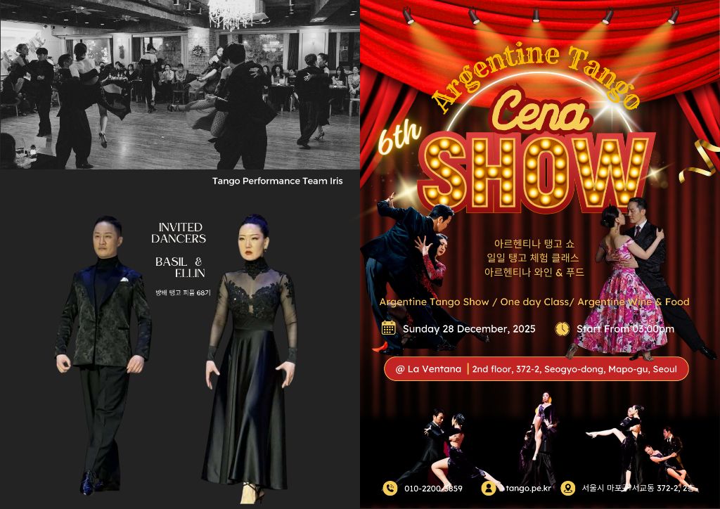 특별한 탱고 문화 체험!! 공연과 식사, 클래스 6차 정기 땅고 쎄나 쇼~~!! 2025.12.28(일) @ 라 벤따나 2 pm~