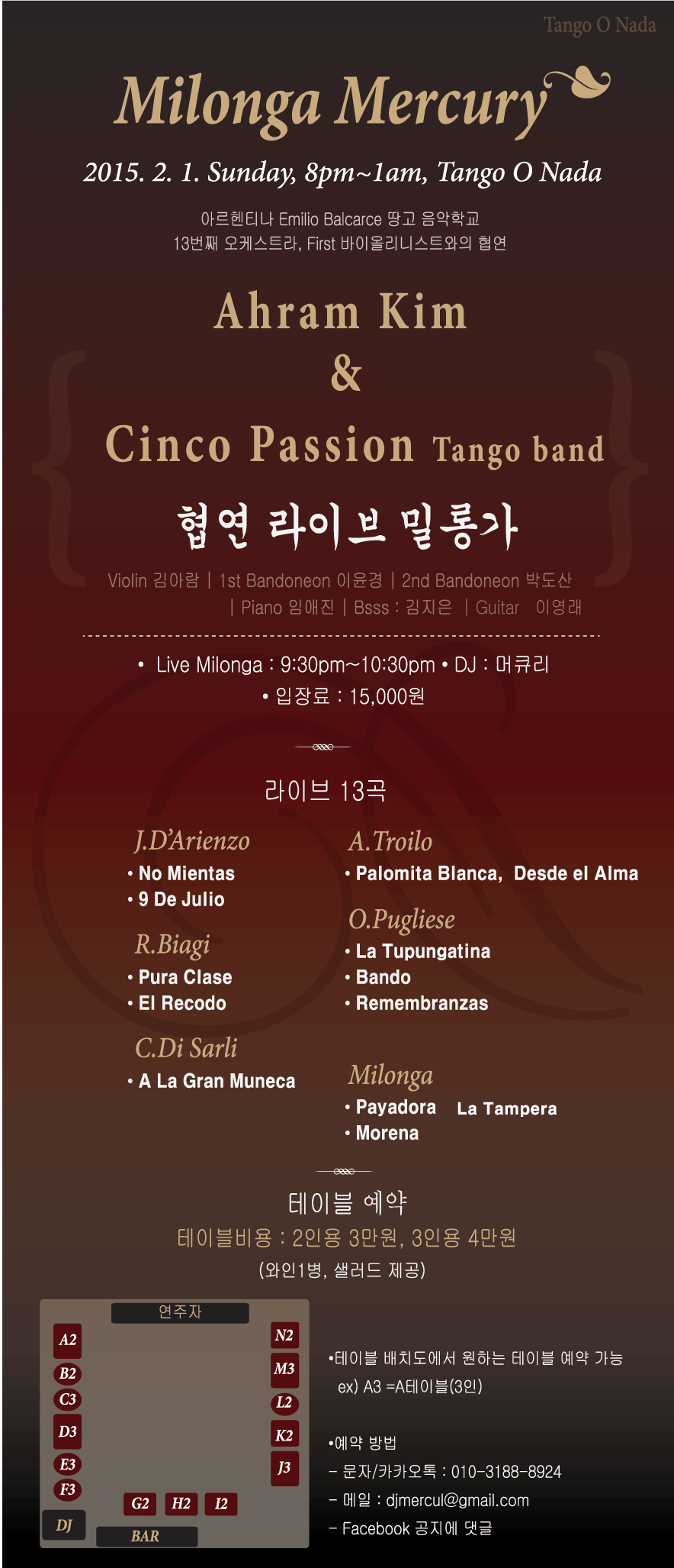 작성자머큐리작성시간15.01.27조회수109 목록 댓글 0[2015년 2월 1일(일요일), Milonga Mercury]