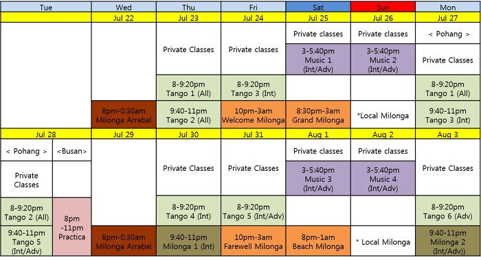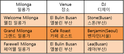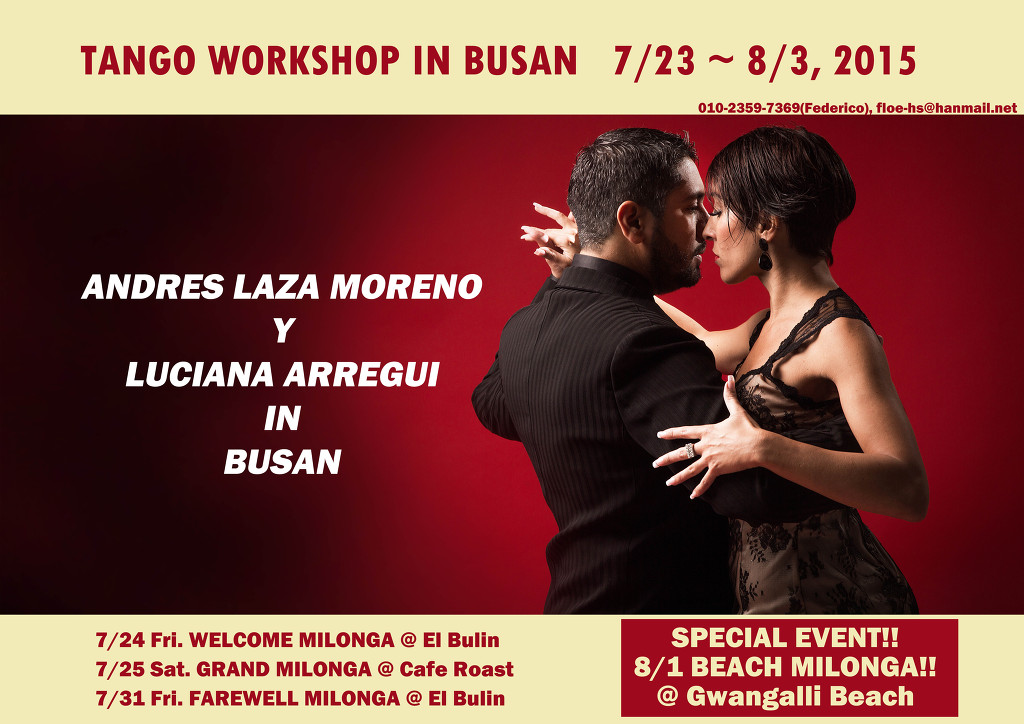 * 이번 워크샵 기간중 부산시에서 주최하는 '부산 바다 축제'의 한 프로그램으로 "해변 탱고의 밤"이 8월 1일 토요일 저녁 8시부터 광안리 해수욕장 만남의 광장에서 열립니다. 여름에 가장 '핫' 한 장소인 광안리 해수욕장에서 '리얼' 해변밀롱가를 무료로 즐기실 수 절호의 기회입니다. 워크샵과 밀롱가 공연을 통해서는 전통 탱고의 우아함과 그 섬세한 아름다움을 만끽하고, 해변 밀롱가를 통해서는 시원한 바닷바람 속에서 젊음의 열기와 낭만에 흠뻑 젖는 시간이 될 것입니다.