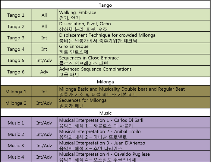 이번 워크샵에서는 총 12개의 주제를 다룹니다. 땅고의 기본적인 원리와 테크닉 그리고 밀롱가에서 응용할 수 있는 패턴에 대한 수업이 6개, 밀롱가의 기본 비트와 응용 동작에 대한 수업 2개가 준비되어 있습니다. 그리고 이번 워크샵의 특별한 주제인 "음악의 해석" 수업이 4개 준비되어 있습니다. 이 수업에서는 각 악단의 연주를 듣고 그 특징을 이해하고 이를 실제로 표현하는 연습을 하게 됩니다. "음악의 해석" 수업은 내용상 각각의 수업이 2시간 40분, 즉 2개 클래스에 해당하는 길이의 수업으로 진행이 됩니다.