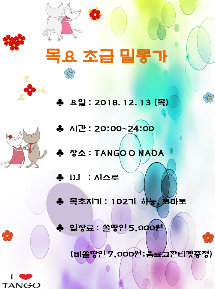 행복함과 따뜻함이 가득한 목초밀이 낼로 다가왔어용~ 앞뒤 꽉꽉 막힌 곳 가지 마시고~ 요기~ 요기~ 목초밀로 오셔용~ 우리가 배운 피구라를 마구 마구 펼쳐볼 수 있는 목초밀에서 모두 탱고에 흠뻑 빠져보시길~ ^0^ |