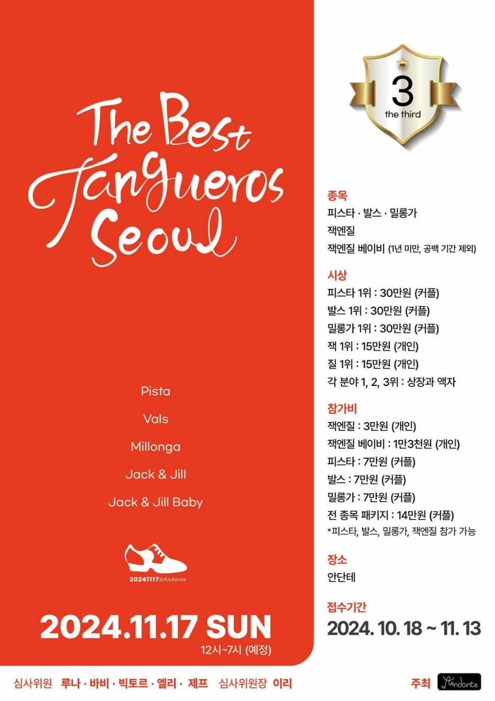 이번 대회 Best Tangueros Seoul 2024는 내가 늘 다니던 안단테홀에서 진행되었고 나는 올해 특별히 신설된 탱고신인(베이비라고도 함. 여자는 탱고입문한지 1년미만, 남자는 3년미만으로 자격제한) 잭&질부문에만 참가했다.