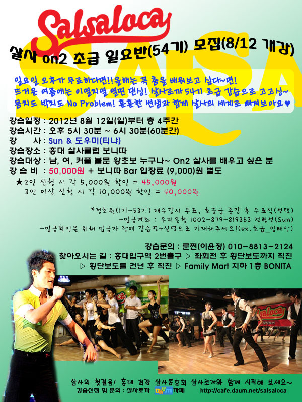[스크랩] [서울][Sun]Salsa on2 54기 초급반(8/12, 4주) 모집! 작성자지뽕|작성시간12.08.08|조회수9 목록 댓글 0 글자크기 작게가 글자크기 크게가 * 강습 신청양식 * 말머리 선택에 수강신청반, 남, 여 구분해 주시고 아래 신청양식에 맞춰서 작성해 주세요^^* 1. 닉네임 / 실명 : 룬쩐 / 이윤정 2. 연락처(핸드폰) : 010-8813-2124 3. 입금여부 / 입금자명 : 입금완료 / 이윤정(초급_룬쩐) 4. 소속동호회 : 살사로까 5. 하고 싶은 말 : 로까 만쉐이~~* ** 입금계좌 - 우리은행 1002-546-819353 전병선(Sun) 다음검색 스크랩 원문 : 살사로까 [살사댄스,바차타] 현재 게시글 추가 기능 열기 북마크 공유하기 신고 센터로 신고 댓글 댓글 0 댓글쓰기 답글쓰기 댓글 리스트
