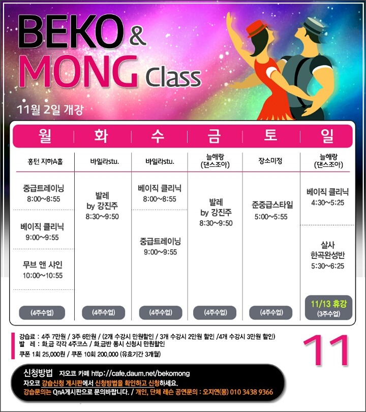 1. 11/13 휴강으로 일요일 수업은 3주(6만원) 입니다~ ♩
