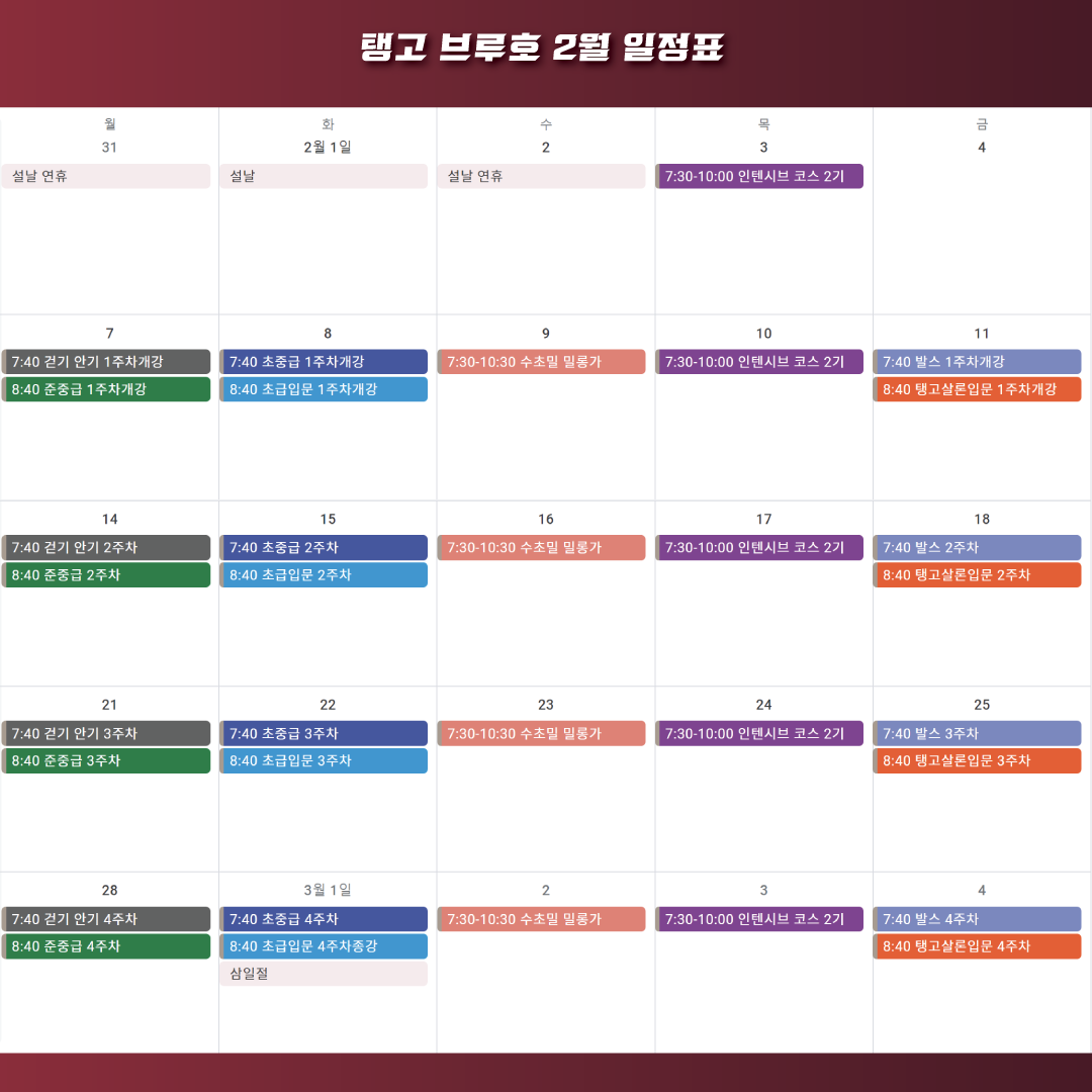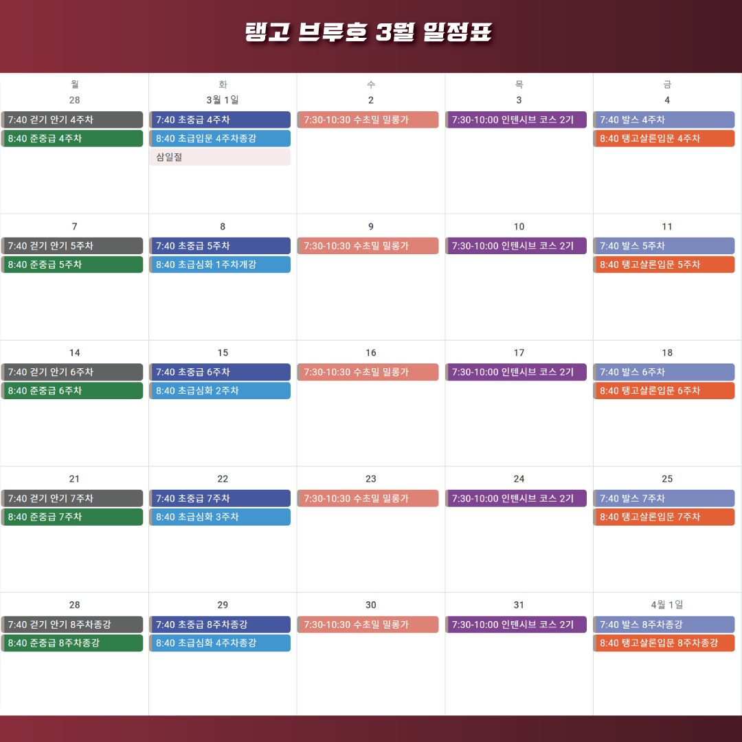 >> 일정 : 2월7/14/21/28일, 3월7/14/21/28일(매주 월요일)