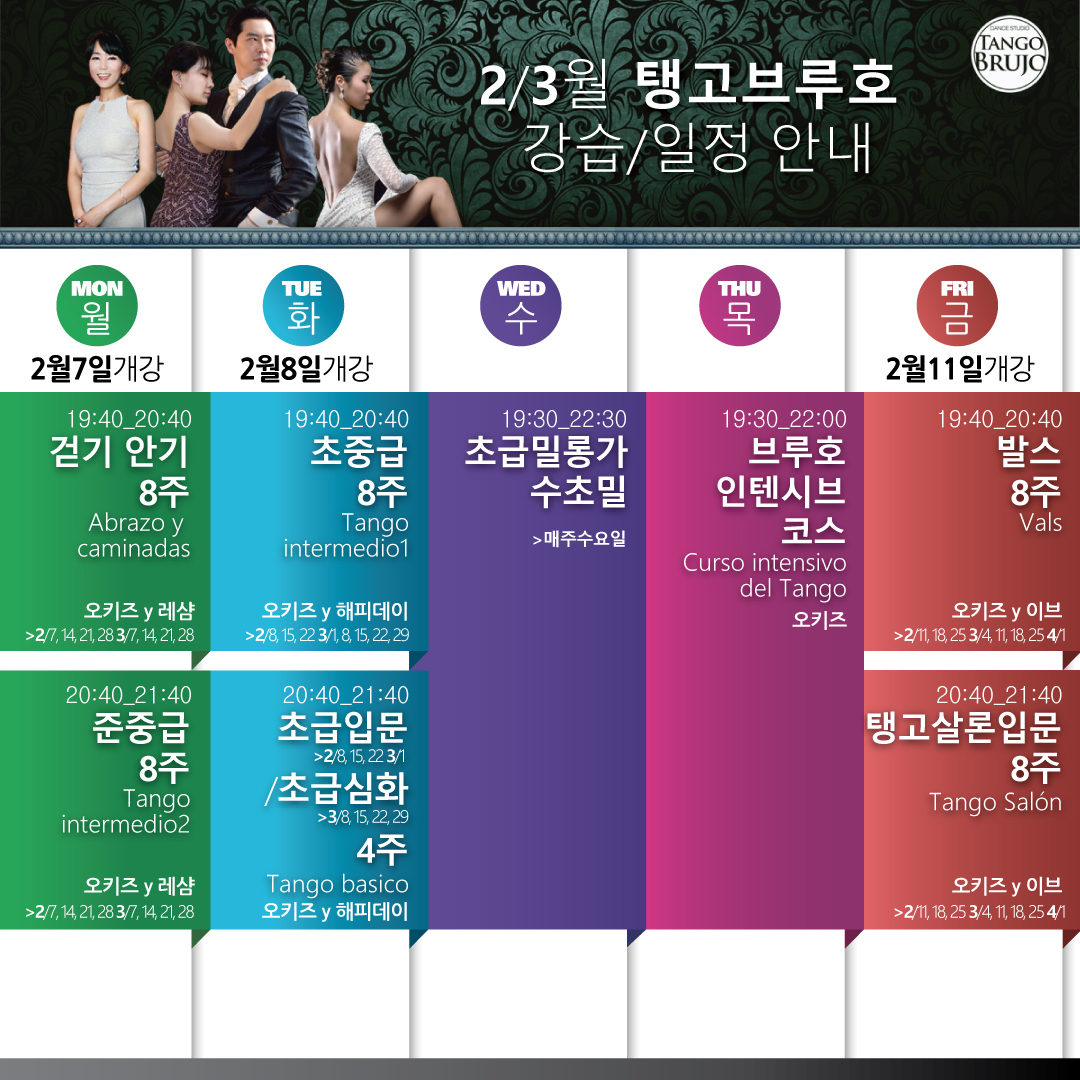 이 수업은 탱고브루호 정규수업 과정에서 초중급수업을 이수하신 분들이 다음단계로 넘어가는 수업입니다.