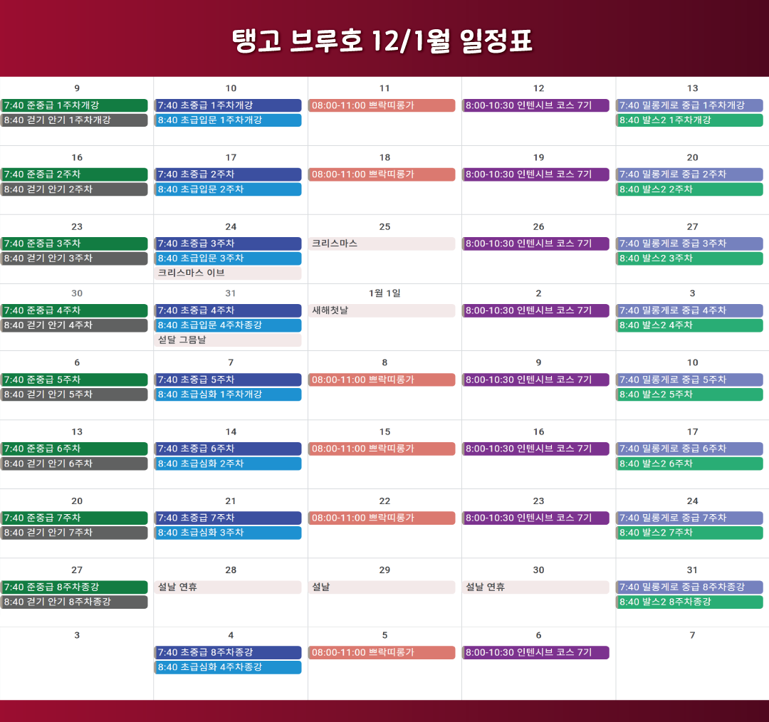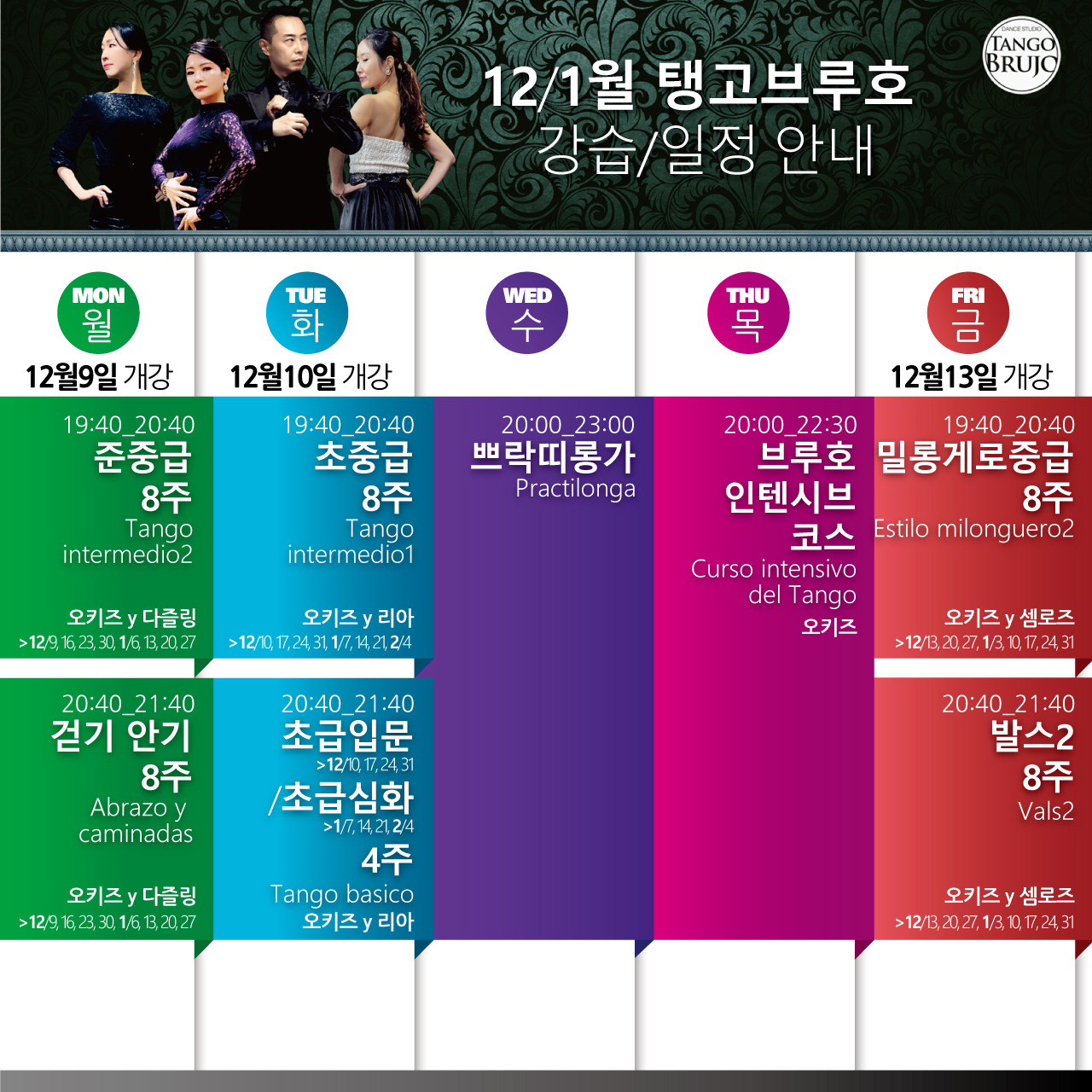 12월 탱고브루호에서 '준중급', '걷기 안기', '초급 입문/초급31기' ,'초중급' , '밀롱게로중급', '발스2'