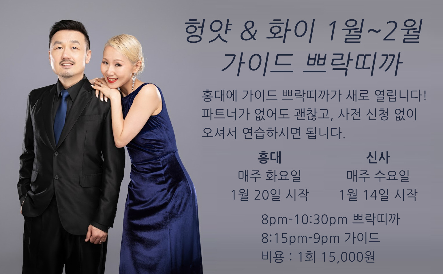 우리의 쁘락띠까는 혼자서 연습하기 어렵거나, 감을 찾고 싶은 분들, 혹은 누군가에게 피드백을 받고 싶은 분들을 위한 열린 연습 공간입니다. 매번 간단한 연습 아이디어를 함께 나누고, 헝얏 & 화이가 직접 여러분과 춤추며 필요한 피드백과 조언을 드립니다. 누구나 환영합니다. 파트너가 없어도 괜찮고, 미리 신청하지 않으셔도 됩니다. 편하게 오셔서, 우리 함께 연습해요.