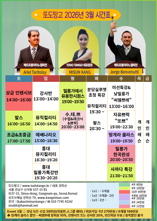 팔로워에게 필요한 테크닉, 아브라소, 커넥션, 뮤지컬리티, 아도르노 등을 배우는 시간입니다. 이번에는 메트로폴리타노 챔피언 Jorge 와 함께하여 더 특별한 시간이 될거에요