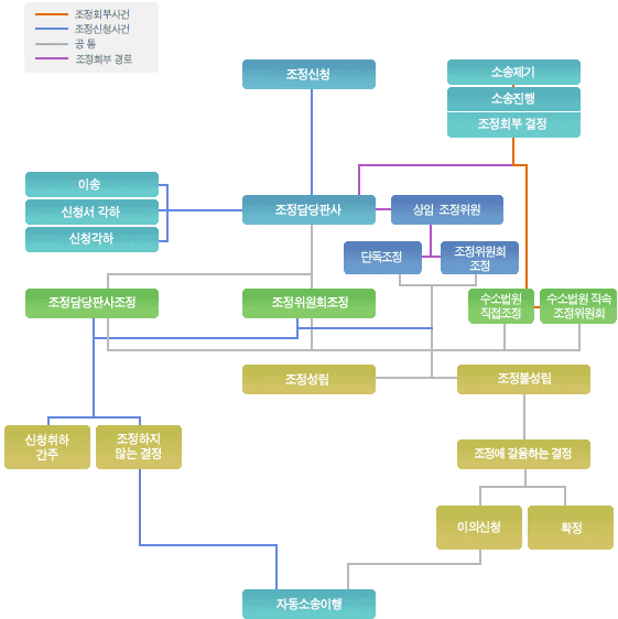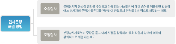 민사조정절차는 조정담당판사 또는 법원에 설치된 조정위원회가 분쟁당사자로부터 주장을 듣고 여러 사정을 참작하여 조정안을 제시하고 서로 양보와 타협을 통하여 합의에 이르게 함으로써 분쟁을 평화적이고, 간이·신속하게 해결하는 제도입니다. |