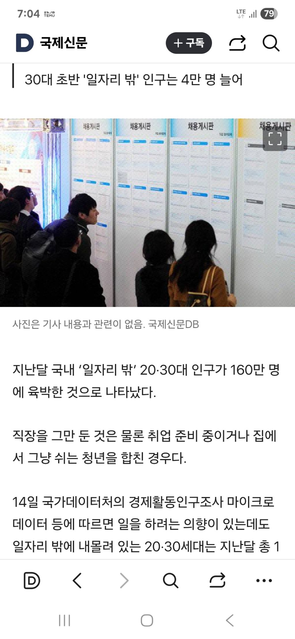 지난달 국내 ‘일자리 밖’ 20·30대 인구가 160만 명에 육박한 것으로 나타났다.
