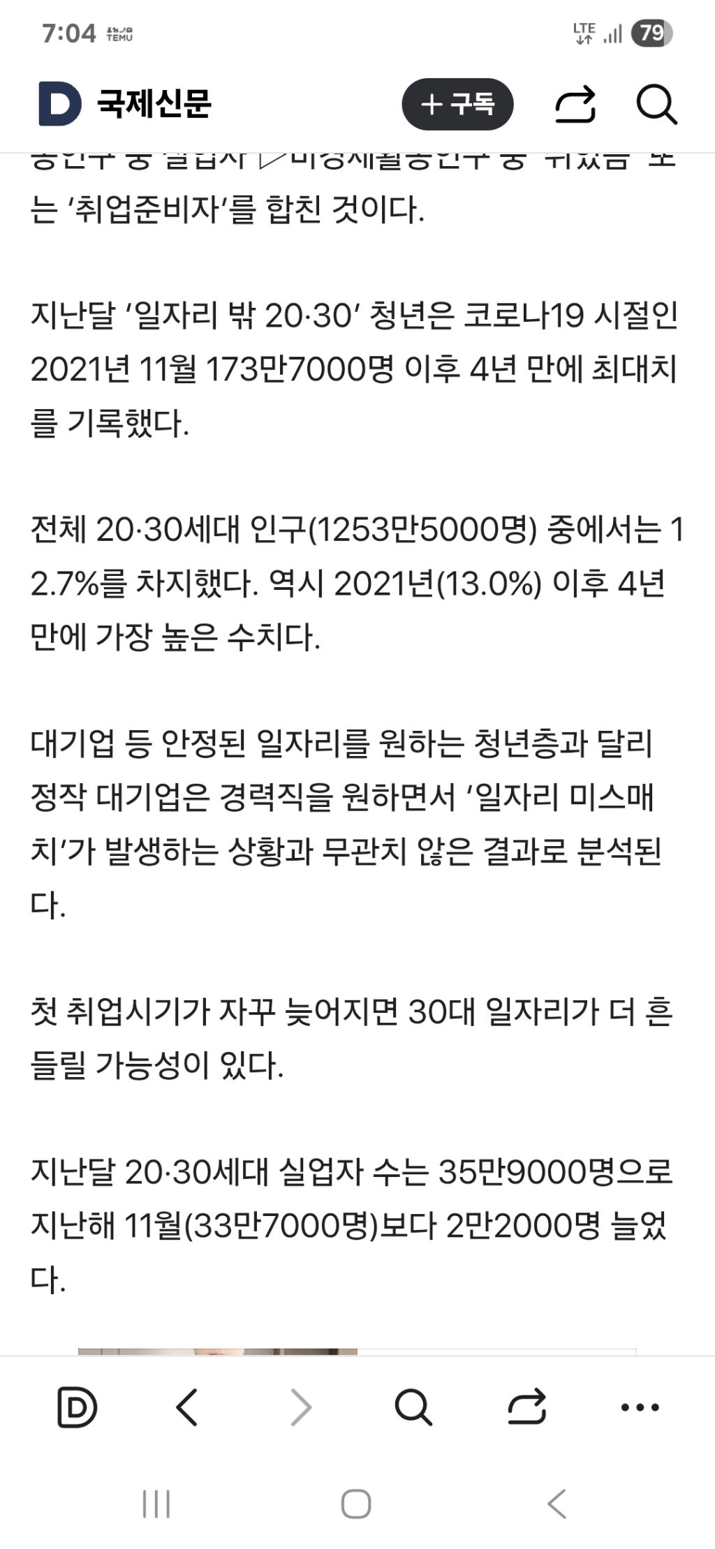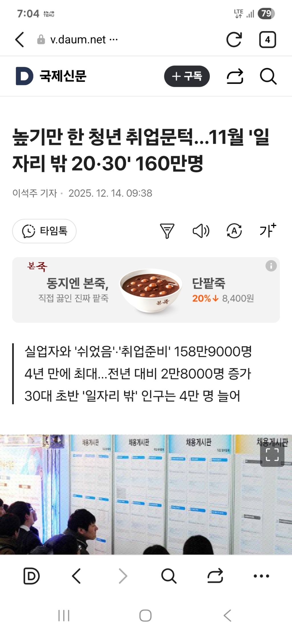 지난달 ‘일자리 밖 20·30’ 청년은 코로나19 시절인 2021년 11월 173만7000명 이후 4년 만에 최대치를 기록했다.