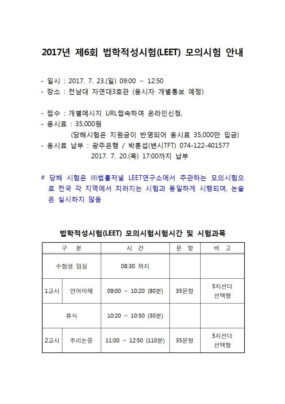 2017년 제6회차 법학적성시험(LEET) 모의시험 안내 작성자고시원 조교|작성시간17.07.13|조회수109 목록 댓글 0 글자크기 작게가 글자크기 크게가 다음검색 현재 게시글 추가 기능 열기 북마크 공유하기 신고 센터로 신고 댓글 댓글 0 댓글쓰기 답글쓰기 댓글 리스트