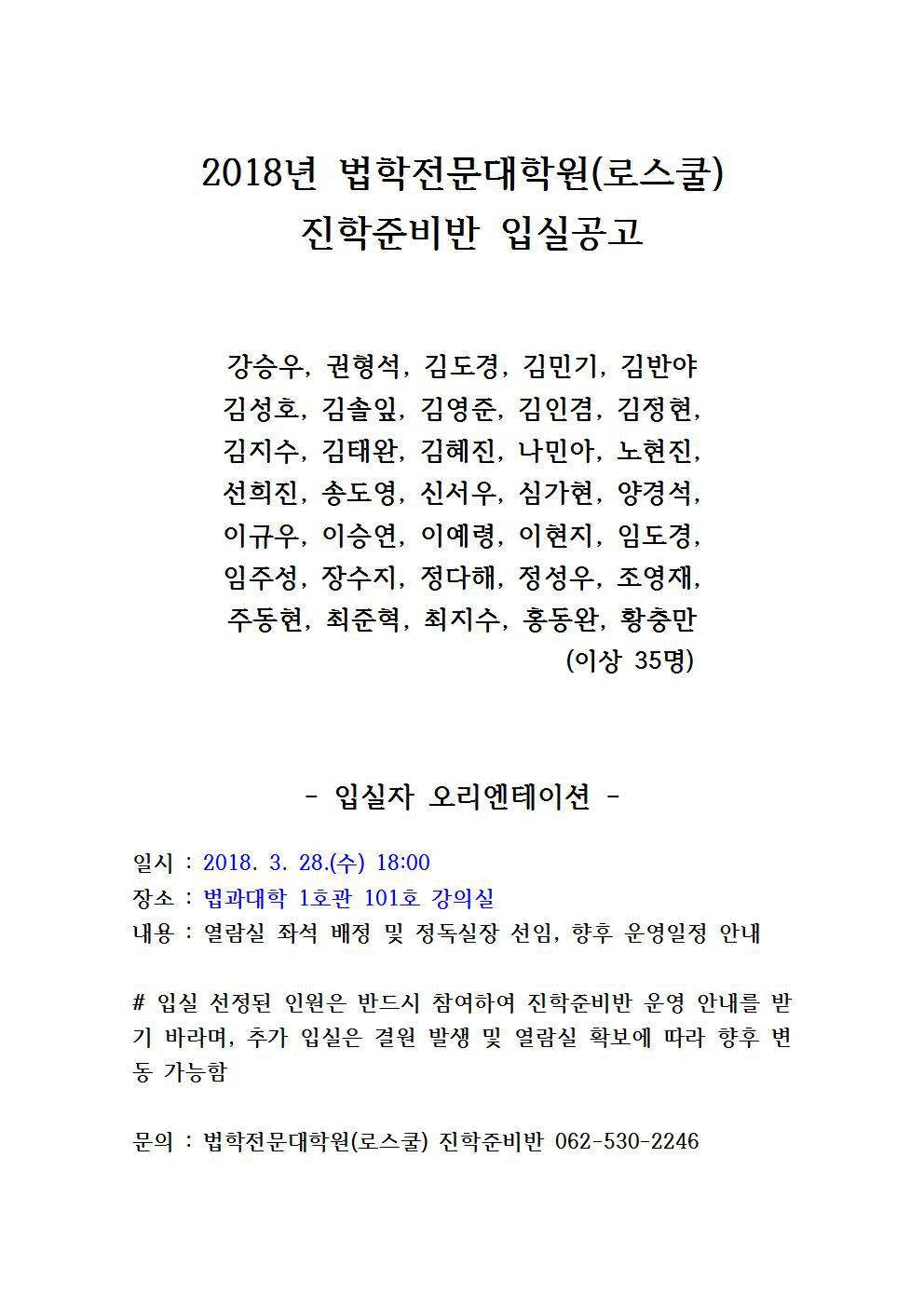 2018년 법학전문대학원(로스쿨) 진학준비반 입실 확정 공고 작성자고시원 조교|작성시간18.03.27|조회수616 목록 댓글 0 글자크기 작게가 글자크기 크게가 다음검색 현재 게시글 추가 기능 열기 북마크 공유하기 신고 센터로 신고 댓글 댓글 0 댓글쓰기 답글쓰기 댓글 리스트